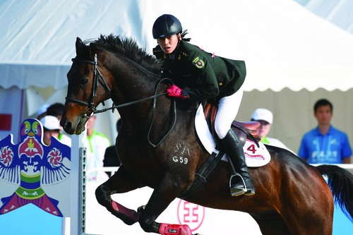 中国队选手在现代五项决赛女子马术比赛中。