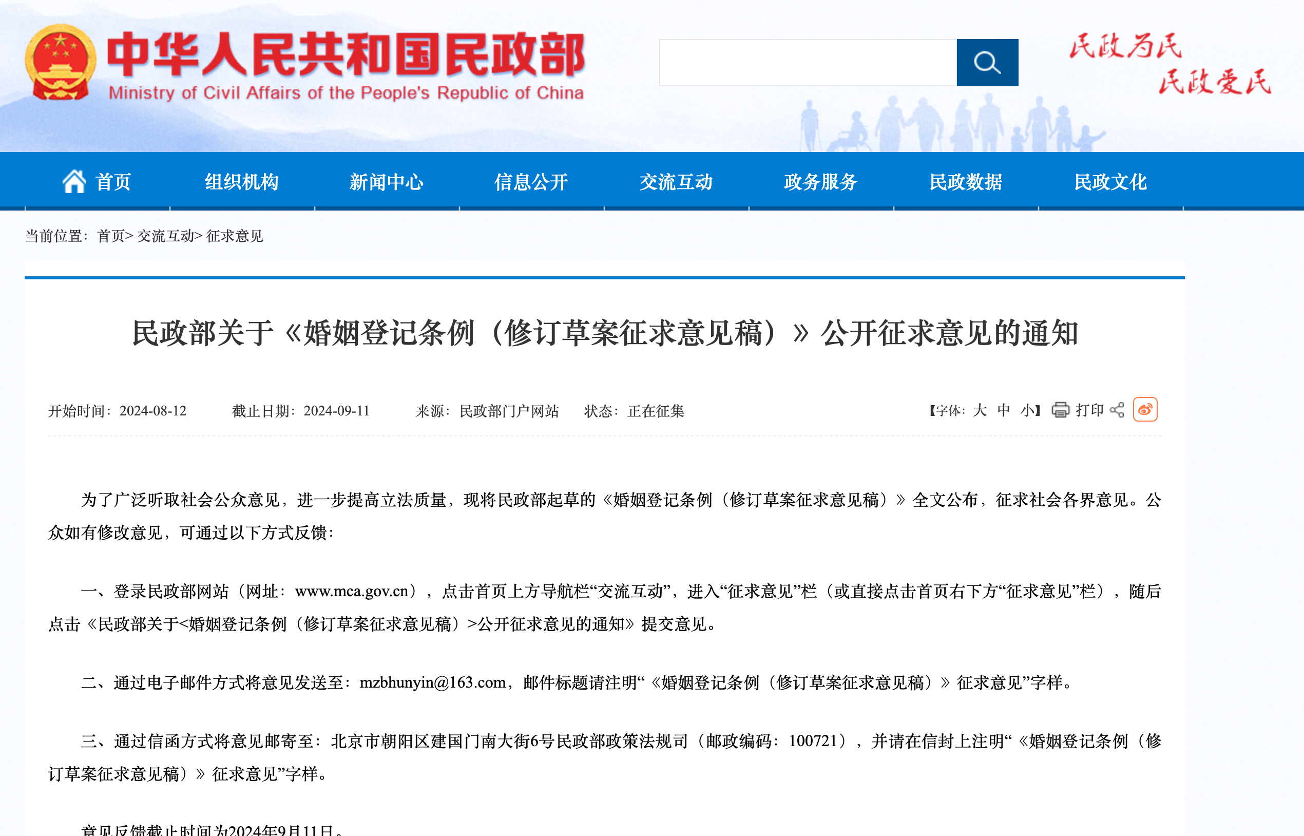 为了广泛听取社会公众意见,进一步提高立法质量,现将民政部起草的《婚姻登记条例(修订草案征求意见稿)》全文公布,征求社会各界意见。公众如有修改意见,可通过以下方式反馈: 一、登录民政部网站(网址:www.mca.gov.cn),点击首页上方导航栏“交流互动”,进入“征求意见”栏(或直接点击首页右下方“征求意见”栏),随后点击《民政部关于<婚姻登记条例(修订草案征求意见稿)>公开征求意见的通知》提交意见。 二、通过电子邮件方式将意见发送至:mzbhunyin@163.com,邮件标题请注明“《婚姻登记条例(修订草案征求意见稿)》征求意见”字样。 三、通过信函方式将意见邮寄至:北京市朝阳区建国门南大街6号民政部政策法规司(邮政编码:100721),并请在信封上注明“《婚姻登记条例(修订草案征求意见稿)》征求意见”字样。 意见反馈截止时间为2024年9月11日。 民政部 2024年8月12日 |