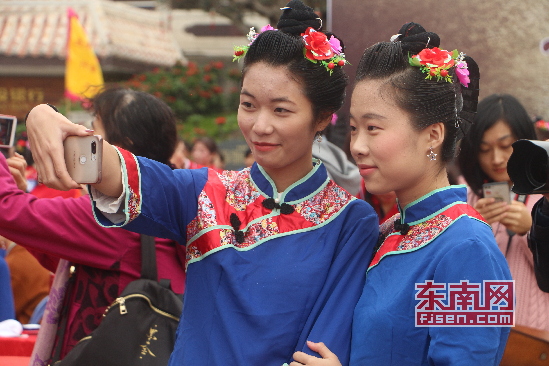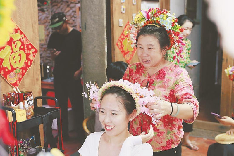 “三把刀”造型成为福州三坊七巷街头的亮眼风景。人民网记者 焦艳 摄 这种“武器”上头的打扮,传说既是为了固定发髻,也是为了防身,颇能体现旧时福州女性刚柔并济、勇毅独立的铿锵之美。今年6月,“福州传统妆束技艺”列入福州市鼓楼区第七批非物质文化遗产项目。 “今世簪花,来世漂亮” 古老的簪花重回时尚前沿 蟳埔女以“簪花”著称,她们将各式各样的鲜花插在头发上,形成了一道亮丽的风景线。生活在泉州蟳埔村的渔家女常年在海边劳作,由于海风特别大,散落的头发容易遮眼,她们便将头发盘起,再以各色花朵一圈圈环绕点缀,用象牙白发簪穿插固定,簪花围由此得名。若适逢结婚、节日之时,蟳埔女的头饰会更加隆重,不仅满头鲜花,更配以成圈的金饰。