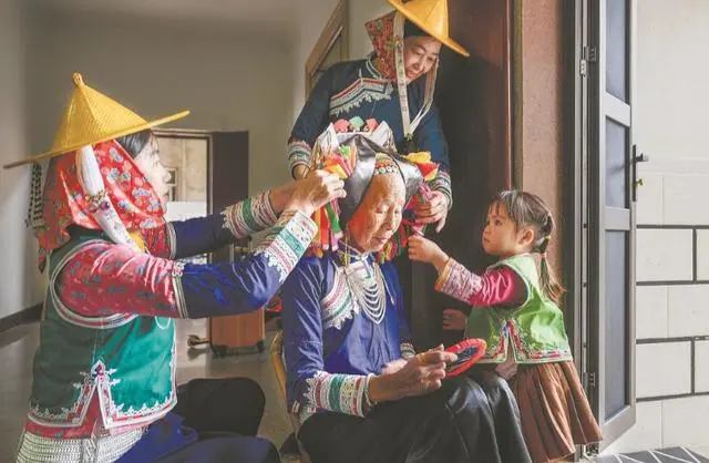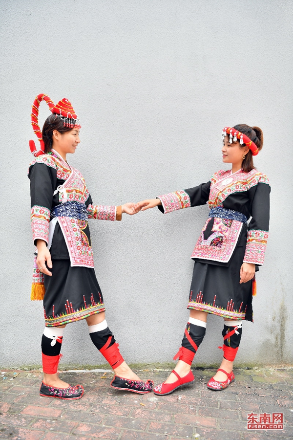 小岞地区老中青少惠安女 图片来源:福建日报 郑慧芬 摄 如此设计,是出于生产和生活的需要。过去,惠安女经常在海边劳作,斗笠既可以遮阳防晒,还可以避雨;头巾可以挡风防沙、御寒保暖;短上衣和短袖口不易被海水打湿,干活方便利索;宽裤便于涉海,打湿了也容易风干。 惠安女服饰不仅承载了“惠女精神”,诠释了劳动产生美、劳动创造美的深刻内涵,也展现了人与自然和谐共生的审美意蕴。2006年5月,惠安女服饰入选第一批国家级非物质文化遗产名录。 罗源畲族服饰 大山里飞出的“凤凰装” 畲族服饰多见于福建省福州市罗源县,畲族作为“山里的客人”,将苎麻织染成布,将花鸟兽虫、农田林木等绣入衣服,主要特色在女性服饰上体现得最为明显,已成为罗源畲族文化最亮眼的名片。