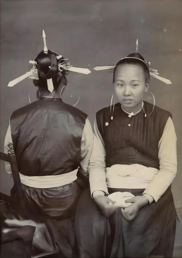 老照片中福州女子头簪“三条簪”的形象。(资料图) “三把刀”由三只刀剑形状的银簪组成,簪的形状扁平如剑,装饰有各种花卉、鸟兽等图案,寓意吉祥如意、幸福美满。梳妆时三簪同插于发髻之间,主簪刀刃向下,左右副簪交叉,刀刃向外。