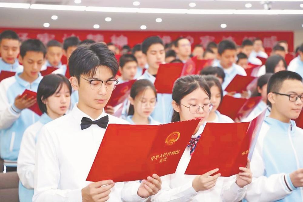 4日上午,教育部组织开展2024年国家宪法日“宪法晨读”活动,福建分会场设在福州格致中学,与会嘉宾、福州格致中学师生代表200余人参加活动。图为师生代表一同诵读《中华人民共和国宪法》的部分条款。本报教育全媒体中心记者 付丽宁 姚兴榕 摄