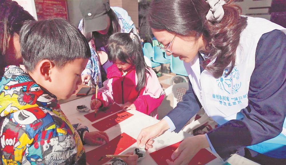 近日,福州市青少年活动中心开展宪法宣传活动。现场,孩子用毛笔书写宪法宣传标语,制作手工书法扇。图为福州市税收“蒲公英”普法志愿者与孩子共同书写宪法宣传标语。薛莹芳 陈晓雪 摄