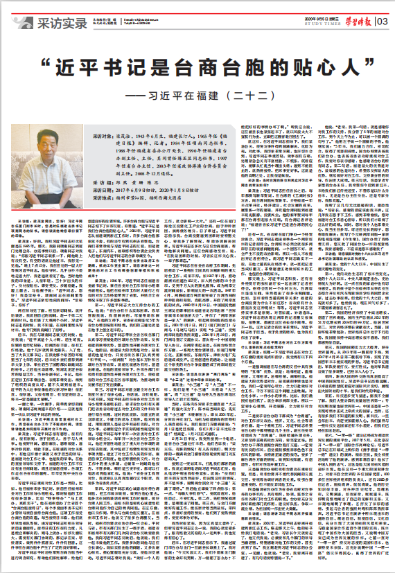 采访对象:梁茂淦,1943年6月生,福建长汀人。1965年任《福建日报》编辑、记者。1984年任项南同志秘书,1988年任福建省委办公厅处长,1990年任福建省台办副主任、主任,其间曾任陈丕显同志秘书,1997年任省台办主任,2003年任省政协港澳台侨委员会副主任。2008年12月退休。 采 访 组:邱 然 黄 珊 陈 思 采访日期:2017年6月9日初访,2020年1月8日核访 采访地点:福州市芳沁园,福州西湖大酒店 采访组:梁茂淦同志,您好!习近平同志任厦门副市长时,您是时任福建省委书记项南同志的秘书。请您谈谈他给您最初留下的印象。 梁茂淦:好的。我和习近平同志初次见面是在1985年。那天,我陪同项南同志到厦门处理公务,办完事情以后,项南同志对我说:“你跟习近平同志联系一下,问他晚上有没有空,有空的话就让他过来,我想见一见他。”晚上7点15分,我在住处的一层大厅等候习近平同志。他很守时,几乎分秒不差地走进大厅,我老远就看见了他。当时他给我的印象是,人很年轻,三十岁出头的样子,身材很魁梧,雄姿英发,步履稳健。我迎上前去,与他握手说:“近平同志,您好!我是梁秘书,项南同志在房间里等您。”习近平同志亲切地向我问好:“梁秘书,你好!” 两位领导见了面,相互亲切问候,就开始谈话,我就回自己的房间,赶一个第二天用的材料。他们谈了大概两个小时,习近平同志走的时候,我不知道,在房间里埋头写材料,他专门到我房间打了招呼。 后来,我在与项南同志谈天的时候,他对我说:“近平真是个人才啊,后生可畏。你别看他年纪轻轻,但阅历很丰富,很有工作经验。他十几岁就到陕北插队,入了党,当了大队支部书记,在陕北那个艰苦的环境里当了七年的农民,后来被乡亲们推荐到清华大学上学,毕业后当了国防部长耿飚同志的秘书。之后他主动请缨,到河北正定县艰苦的基层工作,当县委副书记、书记。他在正定县工作非常出色,表现非常突出,得到了组织的高度认可,前不久调到福建来。近平的为人处事很像他的父亲习仲勋!很正直,很厚道,又很有理想,有坚定的信念。将来一定是前途无量啊。” 一面之缘,一次握手,简单而亲切的问候,项南同志娓娓道来的介绍……这就是我第一次认识习近平同志的情况。 采访组:习近平同志非常重视对台工作,而您在省台办工作了不短的时间,请您讲讲他是如何指导开展对台工作的。 梁茂淦:习近平同志很有思想、很有内涵、很有原则,善于团结人,善于与人共事。他视野开阔、思想解放、思维敏捷,遇事冷静沉着,经验丰富。在敏感的对台关系中,有他这样德才兼备又敢于担当的领导,是福建对台工作之幸,也是我的荣幸。在他的直接领导和支持下,福建的对台工作不仅没有出任何问题,而且还屡创佳绩,各项工作走在各省市的前列,年年受到中央台办表彰。 习近平同志重视对台工作是一贯的。比如,他任福州市委书记时,亲自担任福州市委对台工作领导小组组长。那时候他的工作有很多创新,比如“特事特办”“马上就办,真抓实干”。他在福州创办了全省首个“台商台胞接待日”,每个季度由市委书记和分管领导亲自接待台商台胞。这项工作很受台商台胞的欢迎。每当接待日来临,他们就早早地排队等候,由习近平同志和相关领导亲自出面接待。接待日的工作很有力度,凡是能立即解决的,则马上就办;如涉及面较大,需要有关部门协调的,都记录在案,尽快落实,做到件件抓落实,件件有回音。这件事在台商台胞中产生了广泛的良好影响。 习近平同志平时还经常到台商台胞当中进行调查研究,帮助他们排忧解难,给他们创造良好的投资环境。许多台商台胞与习近平同志结下了深厚友谊,称赞道:“近平书记是我们台商台胞的贴心人。”2002年,习近平同志从福建调到浙江工作时,许多台商台胞都依依不舍,有的还专程到杭州去看望他。台商们非常珍视与习近平同志的友谊,如冠捷电子、东南汽车、福联纺织等台资企业负责人把他们与习近平同志的合影珍藏至今。 采访组:习近平同志在省委省政府工作期间,抓的工作更全面了,请您讲讲这一时期他的对台工作有哪些创新举措和积极成果? 梁茂淦:1996年,习近平同志任福建省委副书记时,兼任省委对台工作领导小组常务副组长。他把在福州市工作时大量行之有效的对台工作经验带到了省里,并结合全省情况采取了许多创新举措。 第一,习近平同志大力支持台办的工作。他说:“省台办有什么实际困难,你尽管跟我说,我能解决的,尽量帮助你解决。”在他的支持下,省委省政府连续5年为省台办增加编制和经费。我们的三通处就是在他手上创立起来的。 第二,习近平同志带领全省各级各部门认真学习贯彻党的各项对台方针政策,发挥福建的独特优势,创造性地开展各项对台工作。他指出,福建最大的优势是对台,最敏感的也是对台,只要各级各部门认真贯彻“和平统一、一国两制”对台基本方针和各项对台方针政策,就能化敏感为有利,创造出奇迹。在他的直接领导下,各级各部门积极而有创造性地开展各项对台工作,使福建省的对台工作走在各省市前列,为推动两岸发展作出了突出贡献。 第三,习近平同志对建立健全对台工作制度付出了很多心血。俗话说,没有规矩,不成方圆。习近平同志担任省委对台工作领导小组常务副组长后,要求省台办和有关部门把省委省政府过去对台工作的文件和政策进行综合梳理,过时