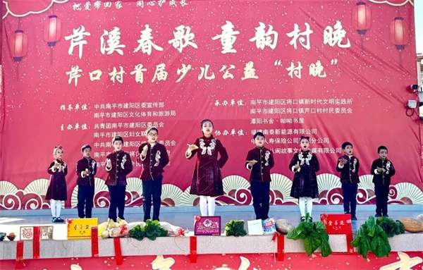 “过新年,贴春联,大人小孩笑开颜。穿新衣,戴新帽,欢天喜地放鞭炮。又请客,又串门,还能拿到大红包。春到人间喜气添,家家户户过新年。” 在快板声声中,南平市建阳区将口镇芹口村的“把爱带回家 同心护成长”少儿公益“村晚”开场了,《村娃闹春》《好运来》《大中国》等舞蹈、诗歌朗诵、快板、古筝表演接连上演,为乡村儿童们带来了一场酣畅淋漓的中华民族的传统文化的洗礼。