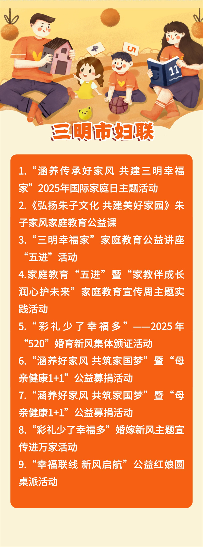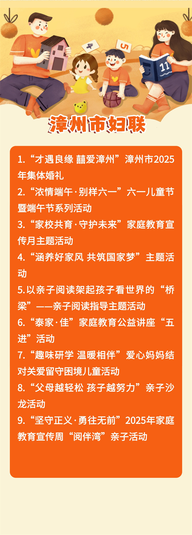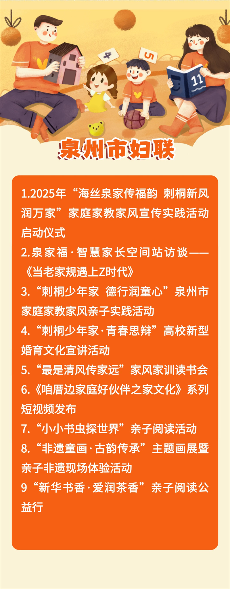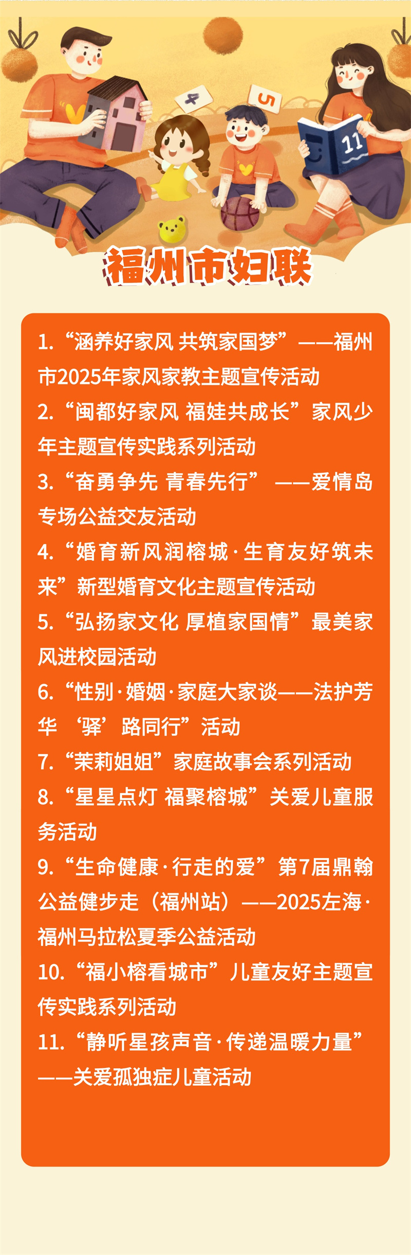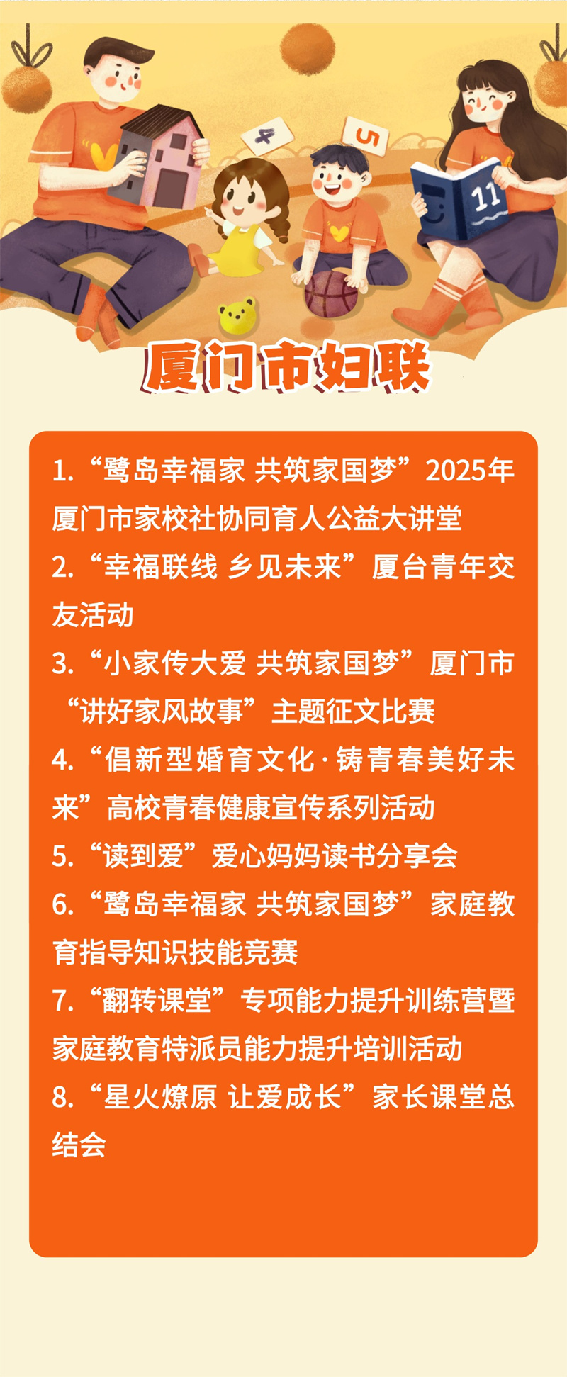 5月11日,省妇联以“幸福家 共筑梦”为主题启动2025年福建省家风家教主题宣传月活动。全省妇联系统纷纷响应,精心策划一系列主题活动,邀您共赴家风家教主题宣传活动的智慧盛宴。从沉浸式家风研学,到新型婚育文化宣讲,从家庭教育公益课堂,到亲子家书诵读雅集…… 引领广大家庭传承“家文化”,凝聚 “家力量”,弘扬 “家风尚,共筑“家幸福”!快来点击解锁全省活动,携手共筑新时代的幸福港湾!