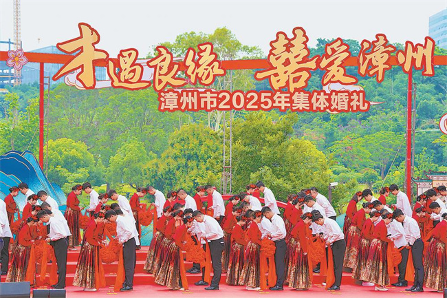 20日,漳州市举行“才遇良缘 囍爱漳州”2025年集体婚礼,百对新人共聚一堂,身着礼服,跨马鞍、过火盆、撒五谷,同读新婚誓词,许下“相守一生、白头偕老”的承诺。图为百对新人现场进行对拜礼。李妙珠游斐渊 摄