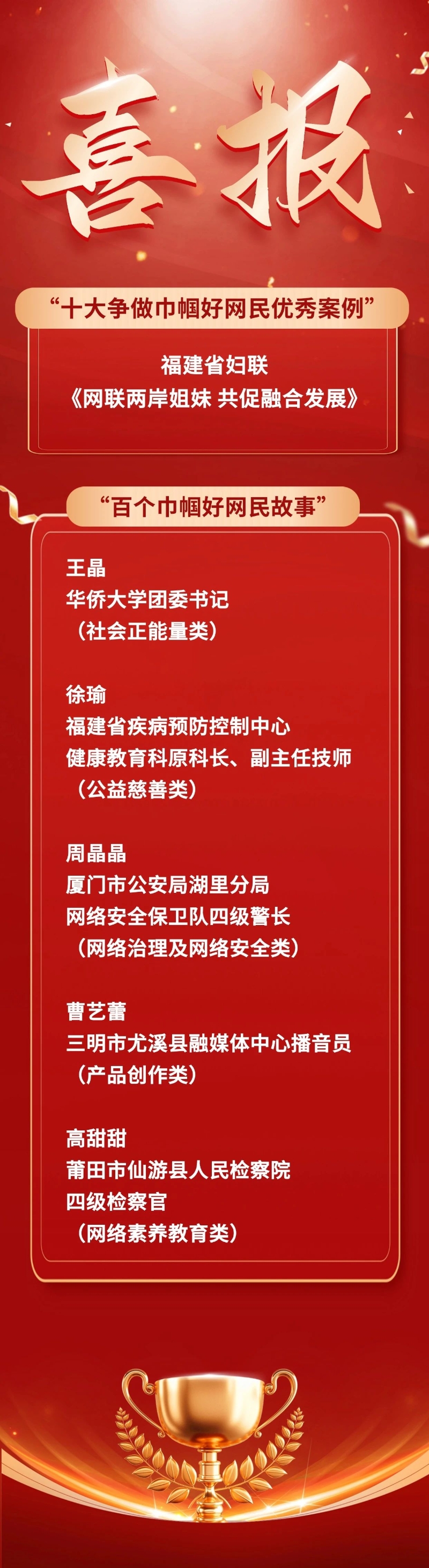5月21日,由全国妇联、中央网信办主办的2025年度“争做巾帼好网民”主题活动启动仪式在安徽合肥举行。活动发布了第五届“百个巾帼好网民故事”暨“十大争做巾帼好网民优秀案例”征集推选结果。福建省妇联报送案例《网联两岸姐妹 共促融合发展》及选送的5个巾帼好网民故事,分别入选十大争做巾帼好网民优秀案例和“百个巾帼好网民故事”,一起来看看吧。