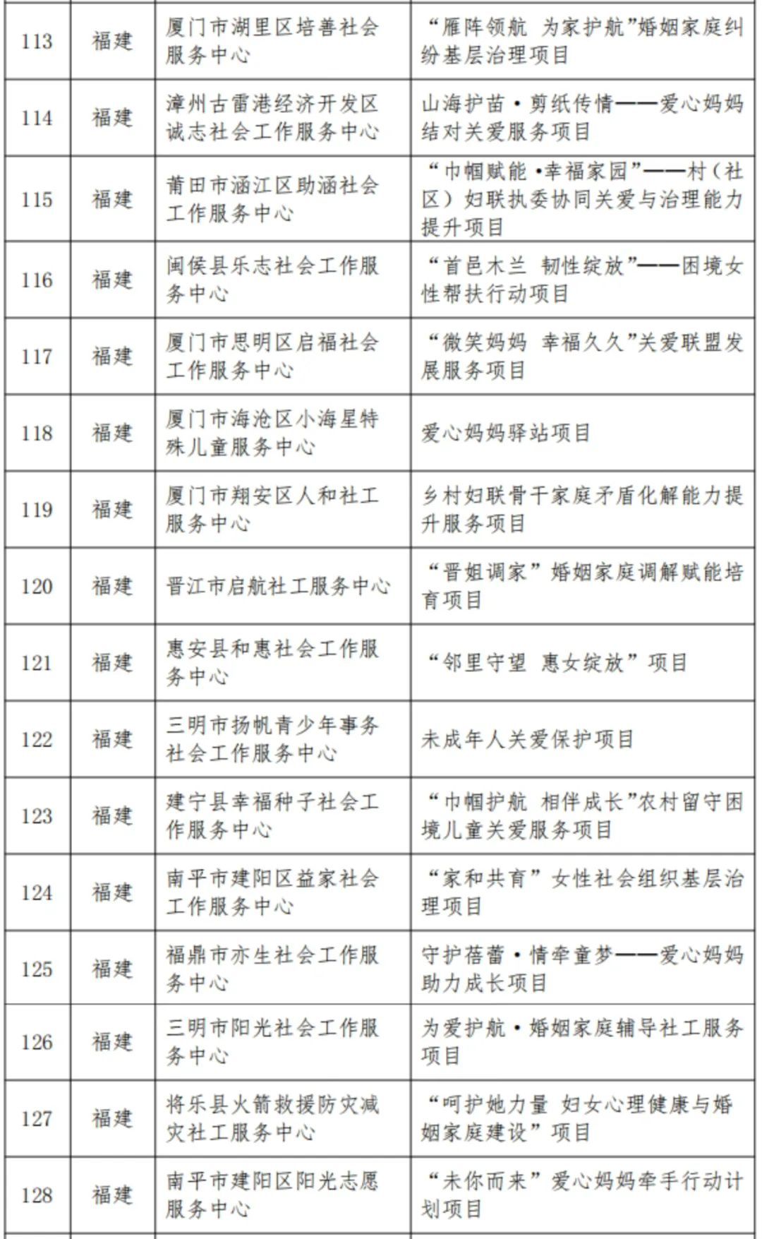 近日,全国妇联社会联络与交流合作中心公布了2025年度“巾帼牵手计划”支持培育女性社会组织领头雁参与基层治理示范项目名单。 在公布的300个培育项目中,福建省妇联推荐的16个项目成功入选,数量位列全国第二。 2025年度“巾帼牵手计划”培育女性社会组织领头雁参与基层治理示范项目名单 (福建部分)