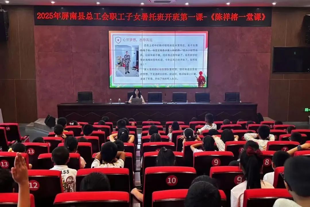《陈祥榕的一堂课》授课现场。 当夏令营的欢笑声还在耳畔,屏南县的孩子们正经历着另一种震撼。屏南县总工会职工子女暑托班用一场感人至深的《陈祥榕的一堂课》拉开序幕。当主讲老师动情讲述陈祥榕烈士“清澈的爱,只为中国”的赤诚誓言时,孩子们被英雄的故事深深打动,纷纷沉浸在陈祥榕烈士用生命书写的爱国之情中。这堂特殊的“第一课”,让戍边英雄的忠诚担当,化作滋润童心的甘霖。 “赋能行动”激发成长动力 从“被动参与”到“主动创造” “今天的研学太有意思了!我不仅认识了各种中草药,体验了水果采摘,还在白茶博物馆里触摸到了家乡的文化根脉,长大后我想为家乡的发展贡献力量。”在福鼎市总工会为农业农村局职工子女量身打造的自然课堂上,暑托班学生陈韵如兴奋地分享着收获。这场别开生面的“山野课堂”,让孩子们在认识家乡中培养乡土情怀,在感悟文化中厚植家国担当。