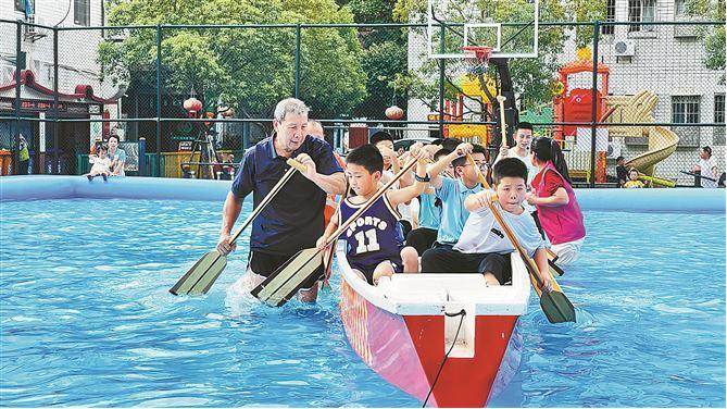 孩子们参加龙舟文化夏令营,体验划龙舟的乐趣。