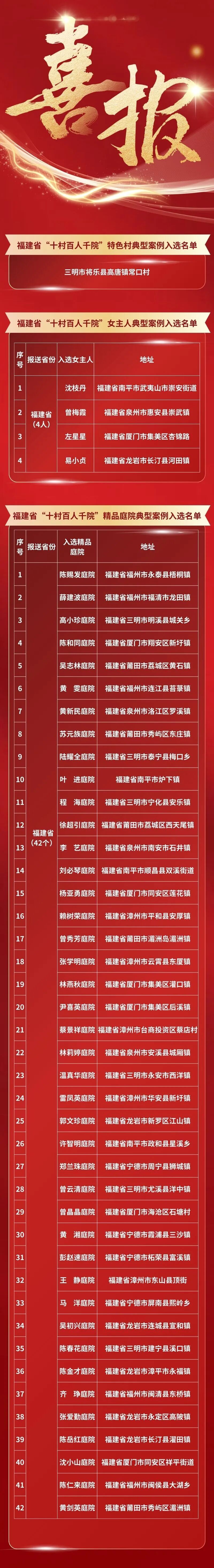 金秋送爽,硕果盈枝。在2025年中国农民丰收节到来之际,全国妇联妇女发展部与中央广播电视总台农业农村节目中心联合发布并推介一批“十村百人千院”典型案例,其中:“美丽庭院”特色村典型案例10个,“美丽庭院”女主人典型案例100人,“美丽庭院”精品庭院典型案例1000户。福建省妇联选送的1个村庄、4名庭院女主人、42个美丽庭院,成功入选全国典型案例!!