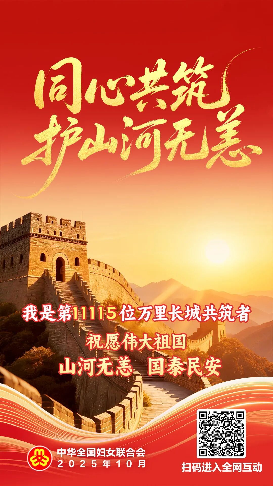 为深入学习贯彻习近平总书记在纪念中国人民抗日战争暨世界反法西斯战争胜利80周年大会上的重要讲话精神,激励引导广大妇女和家庭铭记历史、缅怀先烈、珍爱和平、开创未来,坚定实现中华民族伟大复兴的必胜信心,在2025年国庆节来临之际,全国妇联策划推出“同心共筑 护山河无恙”全网主题互动活动,邀您共赴“长城之约”,在同心共筑中祝福伟大祖国山河无恙、繁荣昌盛! 指尖触动收集砖瓦,每一次为长城添“砖瓦”,都是对祖国万里河山的捍卫。