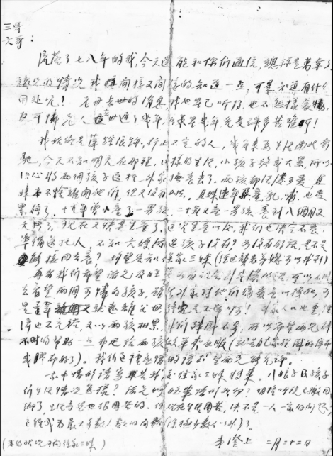家书原稿 家书原文(节选)摘录 三哥、六哥: ……我始终是萍踪浪迹、行止不定的人,几年来为生活南北奔驰,今天不知明天在哪里。这样的生活,小孩子终成大累,所以决心将两个孩子送托外家抚养去了。两孩都活泼可爱,直妹本不舍离开他们,但又没有办法。…… 再者我们希望诸兄及侄辈如有机会到武汉的话,可以不时去看望两个可怜的孩子,虽然外家对他们痛爱无以复加,可是童年就远离父母终究是不幸啊!外家人口也重,经济也不充裕,又以两孩相累,我们殊感不安,所以希望两兄能不时地帮助一点布匹,给两孩做单夹衣服(就是自己家里织的洋布或胶布好了)。我们这种无情的请求望两兄能允许。…… 弟澄上 二月二十二日 |