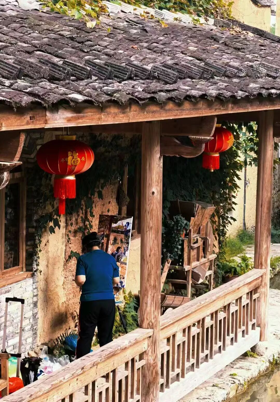 在古意悠悠的村落里,红灯笼上的“福”字与绘画者专注的身影交相辉映,这一笔一画的描摹,是对美丽乡村的深情体悟。
