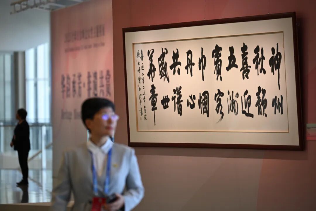 参会的张海迪等嘉宾在全球妇女峰会女性主题特展“华韵承芳·非遗共赏”上合影。新华社记者 胥冰洁 摄