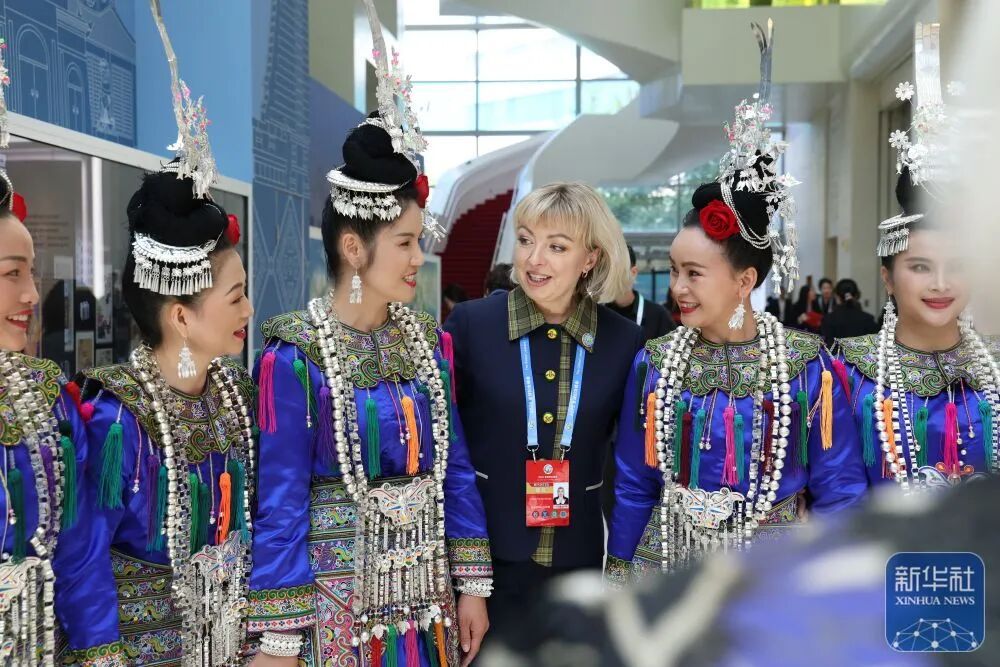 10月14日,来自白俄罗斯的嘉宾在展览现场与侗族大歌表演者们交流。