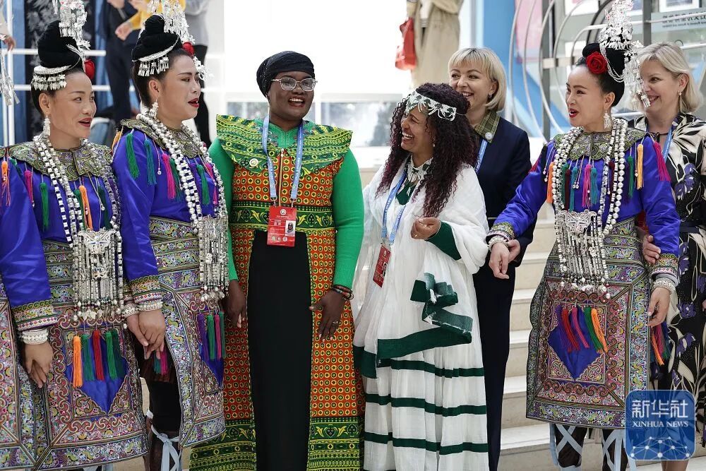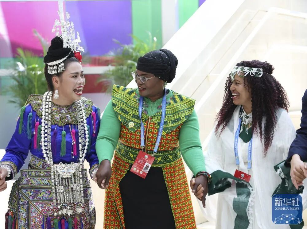 10月14日,来自坦桑尼亚和埃塞俄比亚的嘉宾在展览现场上与侗族大歌表演者们一起载歌载舞。
