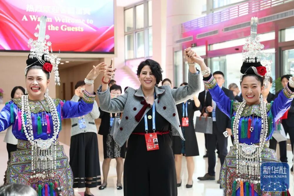 10月14日,来自阿尔及利亚的嘉宾在展览上与侗族大歌表演者们一起载歌载舞。