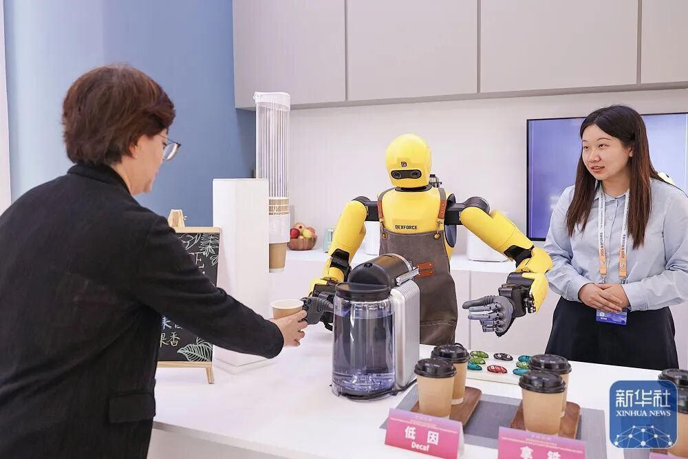 10月14日,参观者在展览上体验机器人制作咖啡。