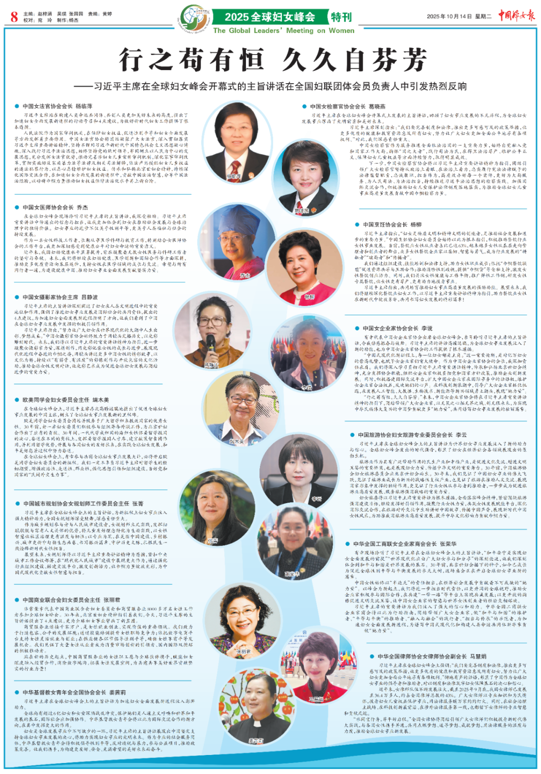中国女法官协会会长 杨临萍 习近平主席站在构建人类命运共同体、共创人类更加美好未来的高度,提出了加速妇女全面发展新进程的行动号召和4点建议,为做好新时代妇女工作提供了根本遵循。 人民法院作为国家审判机关,在保障妇女权益、促进性别平等和妇女全面发展等方面发挥着重要作用。中国女法官协会将团结凝聚广大女法官,深入贯彻落实习近平主席重要讲话精神,坚持不懈用习近平新时代中国特色社会主义思想凝心铸魂,深入践行习近平法治思想,始终坚持党的绝对领导,牢固树立以人民为中心的发展思想,充分发挥女法官优势,推动完善涉妇女儿童案件审判机制,深化家事审判改革,贯彻实施好反家庭暴力法等法律及相关司法解释,依法严惩侵犯妇女儿童权益的违法犯罪行为,以真心真情维护妇女权益。传承和弘扬北京世妇会精神,持续深化国际交流合作,在加速妇女全面发展的新进程中,贡献中国法治智慧,分享中国法治经验,以磅礴巾帼力量推动妇女权益保障法治化水平再上新台阶。 中国女检察官协会会长 葛晓燕 习近平主席在全球妇女峰会开幕式上发表的主旨讲话,回顾了妇女事业发展的不凡历程,为全球妇女发展事业擘画了光明前景和美好未来。 习近平主席深刻指出:“我们要完善制度和法律,推出更多可感可及的政策举措,让更多优质的健康和教育资源惠及所有妇女,努力让广大妇女更加全面公平地享有各项权利。”对此,我们深感责任重大。 中国女检察官作为服务推进全面依法治国的一支重要力量,始终自觉融入党和国家工作大局,胸怀“国之大者”,践行司法为民,在捍卫法治尊严、维护公平正义、保障妇女儿童权益等方面持续努力,取得明显成效。 下一步,中国女检察官协会将以习近平主席重要讲话精神为指引,团结引领广大女检察官坚持从政治上着眼、在法治上着力,忠实履行宪法法律赋予的法律监督职责,忠诚履职,担当作为,高质效办好每一个案件,更好为大局服务、为人民司法、为法治担当,持续推进习近平法治思想的检察实践。加强国际交流合作,积极推动妇女儿童保护法律制度落地落实,为推动全球妇女儿童事业高质量发展贡献中国巾帼检察力量。 中国女医师协会会长 乔杰 在全球妇女峰会现场聆听习近平主席的主旨讲话,我深受触动。习近平主席重要讲话中传递出的信念与担当,让我更加体会到妇女在推动社会发展与全球治理中的独特价值。妇女事业的进步不仅关乎性别平等,更关乎人类福祉与社会的持续发展。 作为一名女性科技工作者,长期从事医学科研与教育工作,特别结合女医师协会的工作平台,我更加深切感受到健康公平对妇女命运的重要意义。 近年来,我国妇幼健康水平显著提升,背后凝聚着无数女性医务与科研工作者的坚守与奉献。未来,我们将继续在妇幼健康、医学创新和国际合作等方面深耕,推动更多优质资源向基层延伸,支持女性在医学领域的成长与交流。希望与所有同行者一道,为建设健康中国、推动妇女事业全面发展贡献坚实力量。 中国烹饪协会会长 杨柳 习近平主席指出,“妇女是物质文明和精神文明的创造者,是推动社会发展和进步的重要力量。”中国烹饪协会妇女委员会始终以此为根本指引,积极推动餐饮行业女性事业发展。当前,餐饮业女性从业者占比已达63%,越来越多女性从基层走向管理者和创业者的舞台,众多女性餐饮企业家以柔韧、智慧与勇气,成为行业发展的“耕耘者”“破局者”和“传播者”。 我们通过组织建设、技能培训和法律支持,助力女性职业成长;依托“巾帼餐饮联盟”促进资源共享与互助合作;推动消除性别歧视,提供“巾帼贷”等金融支持,激发女性餐饮创业活力。同时,我们关注女性健康与工作平衡,推广弹性工作制,研发女性专属餐饮,让女性更有尊严、更有动力地投身事业。 习近平主席指出,共同培育推动妇女事业高质量发展的强劲动能。展望未来,我们将继续深化餐饮业妇女工作,以习近平主席重要讲话精神为指引,助力餐饮业女性在新时代中绽放芳华,共同书写妇女发展的精彩篇章! 中国女摄影家协会主席 吕静波 习近平主席的主旨讲话深刻阐述了妇女在人类文明进程中的重要地位和作用,强调了推进妇女事业发展是国际社会的共同责任,提出的4点建议,为加速妇女全面发展新进程指明了方向,让我们看到了中国在全球妇女事业发展中发挥的积极引领作用。 习近平主席指出,“努力让广大妇女在世界现代化的大潮中人生出彩、梦想成真。”中国女摄影家协会始终致力于用镜头定格历史,以光影雕刻时代。未来,我们将以习近平主席的重要讲话精神为指引,进一步凝聚女摄影家力量,深耕创作,用光影记录女性的成长与进步,展现现代化进程中奋进的巾帼之姿,用镜头讲述更多中国女性的精彩故事,以文化为桥,持续以“有筋骨、有温度”的影像创作与开放包容的文化活动,推动全球女性文明对话,让光影艺术成为促进全球妇女发展与团结进步的重要力量。 中国女企业家协会会长 李谠 有幸代表中国女企业家协会出席全球妇女峰会,亲耳聆听习近平主席的主旨讲话,令我倍感振奋与鼓舞。习近平主席的讲话高瞻远瞩,为全球妇女事业发展注入了新的动能,也为中国女企业家协会的工作提供了根本遵循。 “中国式现代化新征程上,每一位妇女都是主角。”这一重要论断,是