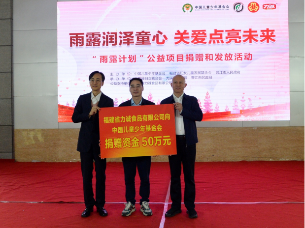 活动现场,福建省力诚食品有限公司向中国儿基会捐赠资金50万元,用于为福建、宁夏两地的400余名困境儿童发放助学金、捐赠“雨露学习角”,改善他们的学习条件和环境,助力他们在阳光雨露下健康成长。在场的8名学生代表接受捐赠,中国儿基会有关部门负责同志向福建省力诚食品有限公司颁发捐赠证书。
