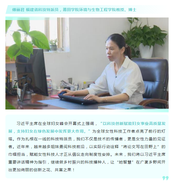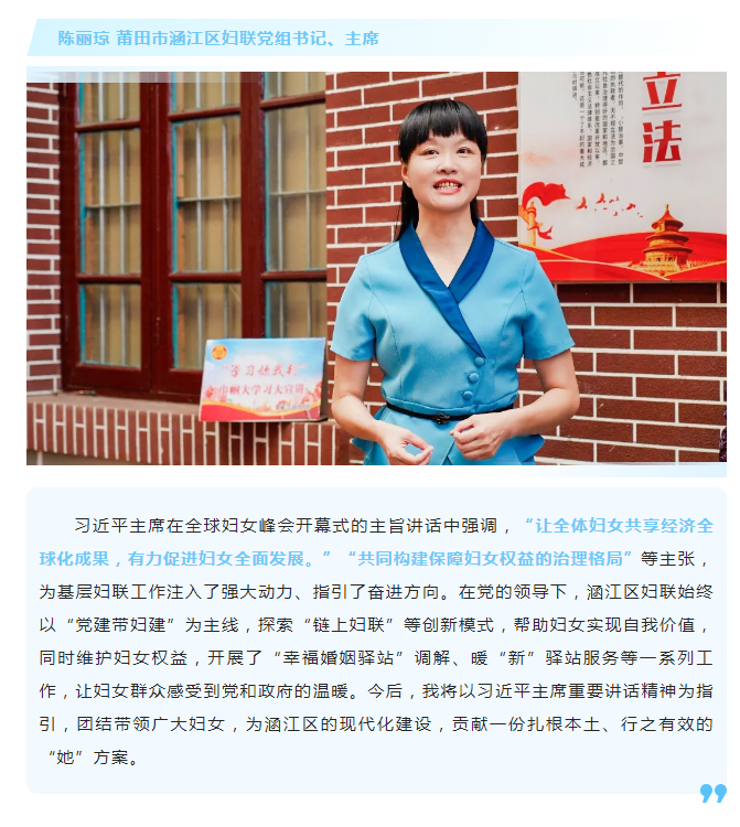 “时代荣光 巾帼芳华”福建省巾帼讲习大赛部分作品 同时,闽姐姐微信公众号开创了“山海回响·巾帼和声”专栏,聚焦全球妇女峰会精神,以福建妇女实践传递峰会理念、凝聚全球巾帼发展共识。