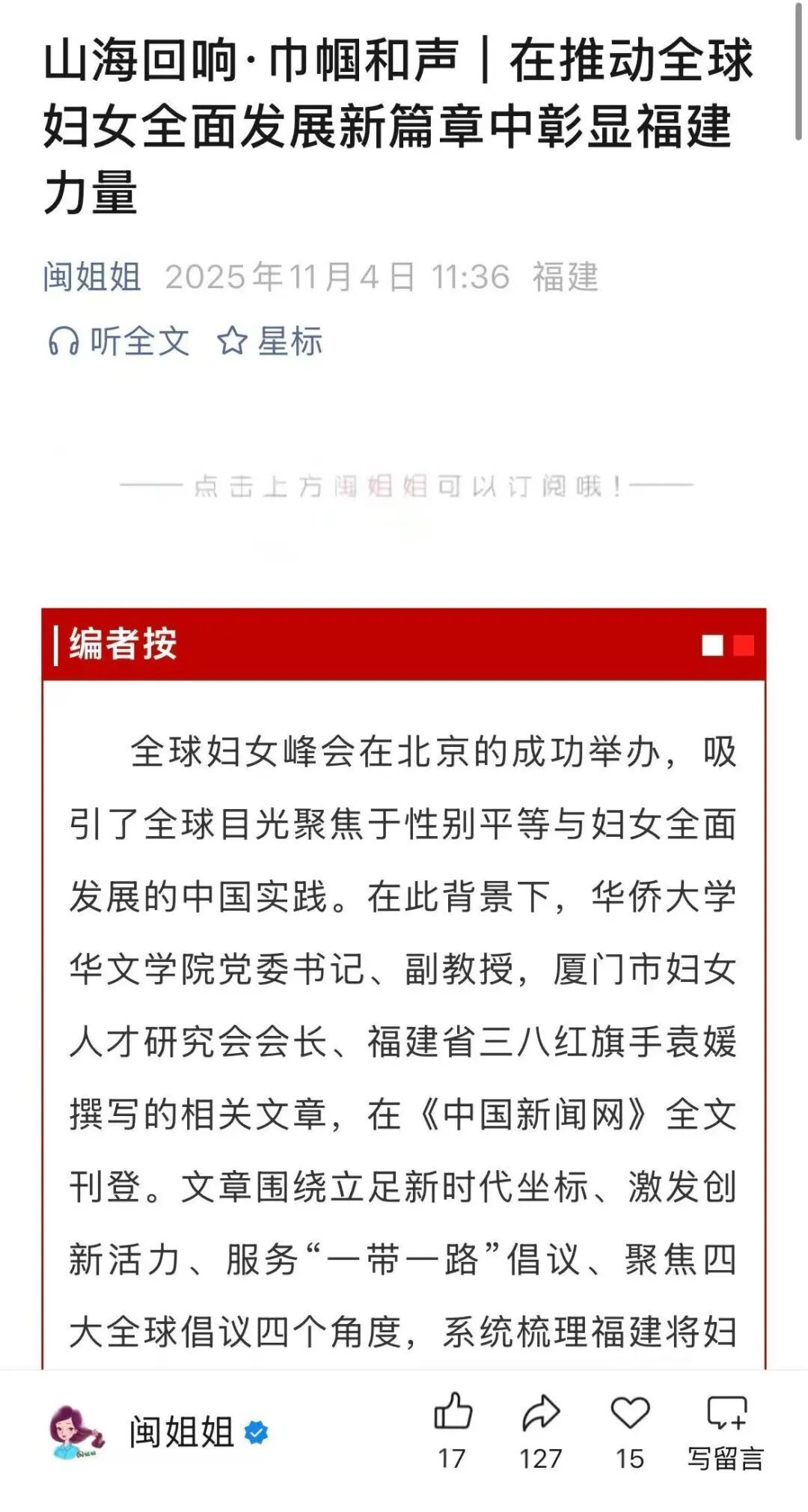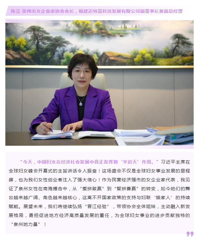 福建省妇联党组书记、主席林叶萍前往福建省女企业家协会会员单位,围绕科技创新、妇女发展等核心议题宣讲调研,与女企业家代表共同探讨新征程下妇女事业与企业创新发展路径;前往福州市罗源县宣讲习近平总书记在全球妇女峰会上的主旨讲话精神,分享了自己参加全球妇女峰会开幕式的现场感受,调研基层妇联组织建设及妇女儿童事业发展情况。