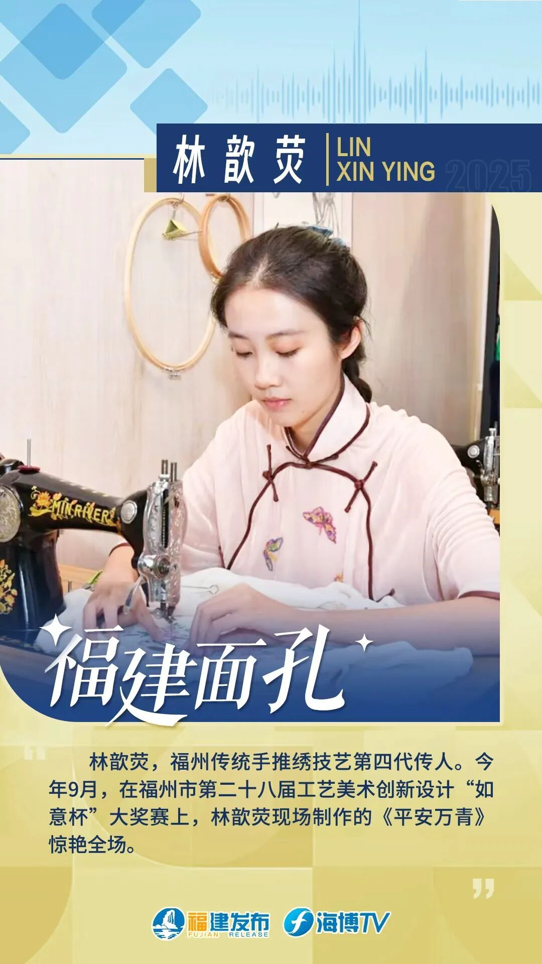今年9月,在福州市第二十八届工艺美术创新设计“如意杯”大奖赛上,林歆荧现场制作的《平安万青》惊艳全场。作品以细腻的包针绣技法,通过丝线的层层叠压,勾勒出强烈的浮雕肌理。突破传统平面刺绣的艺术边界,让在场观众眼前一亮。