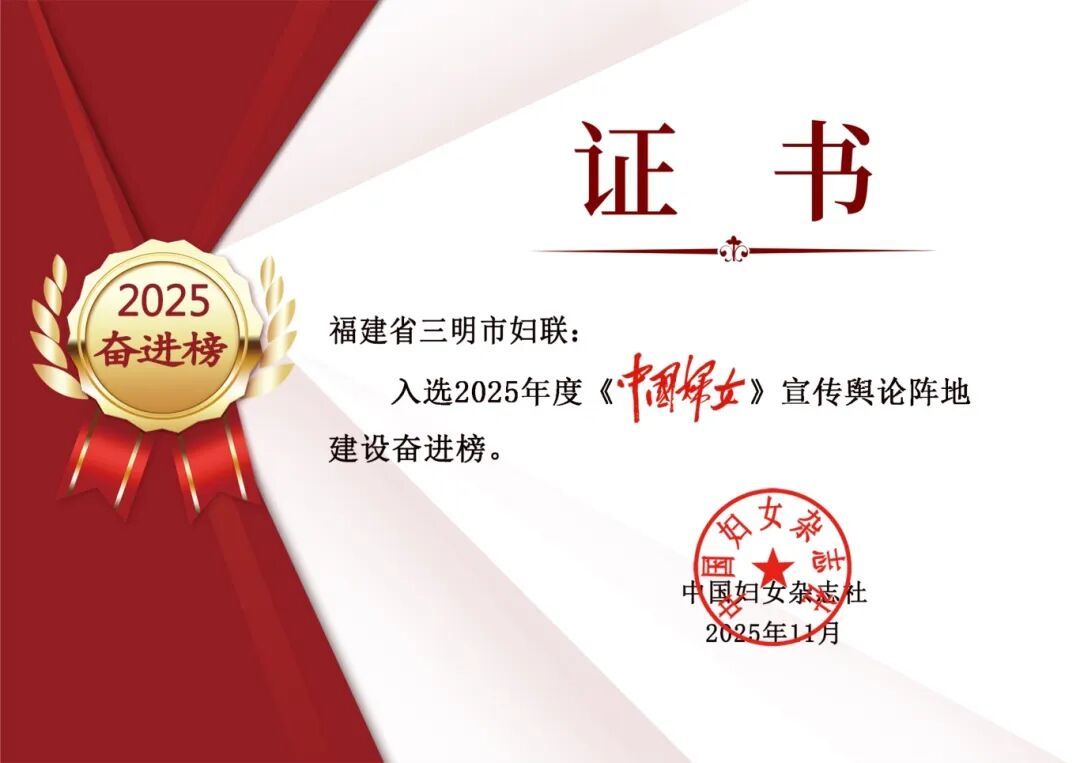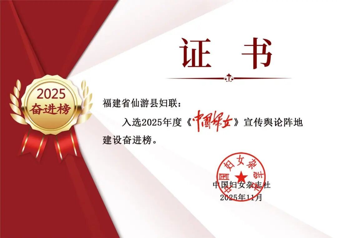 福州市妇联、三明市妇联、泉州市妇联、南平市妇联、龙岩市妇联、宁德市妇联、莆田市仙游县妇联、宁德福安市妇联、宁德福鼎市妇联荣登2025年度《中国妇女》宣传舆论阵地建设奋进榜。