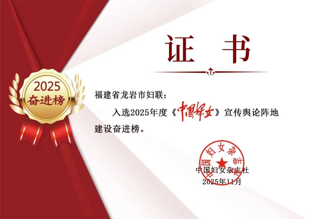 龙岩市上杭县妇联荣登2025年度《中国妇女》宣传舆论阵地建设先进榜。