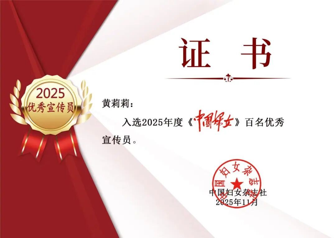 福州市妇联林燕芳、厦门市妇联庄玲、莆田市妇联范彩霞、三明市妇联陈丹、南平市妇联李群、龙岩市妇联谢梦妮、宁德市妇联黄莉莉入选2025年度《中国妇女》百名优秀宣传员。