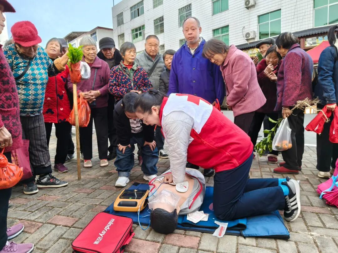 福州市永泰县红十字精神传播志愿服务队队长郑荣平向妇女群众传授心肺复苏(含AED使用)和气道异物梗阻现场处理技能。 暖心普法润万家 维权理念入人心