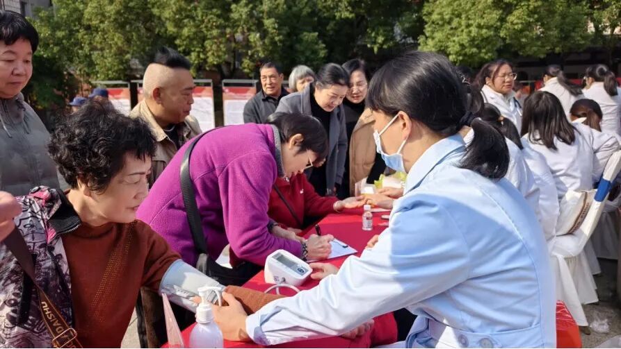 南平武夷山市星村镇妇联联合镇卫生院在街区设立集中志愿服务点,耐心为过往群众测量血压,认真倾听妇女们的健康咨询,并细致讲解妇幼保健知识。