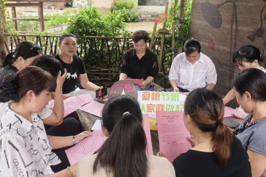 三明市尤溪县妇联组织各村妇联执委在美丽庭院中共读节粮倡议,实地学习“庭院菜园”布局、绿植养护、粮食储存等实用技巧。