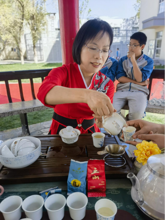 传承丝路文脉 共绘润疆画卷 在疆期间,庄小萍不仅是一名英语教师,更是促进泉昌文化深度交流的使者。她积极组织各类别开生面的文化交流活动,让泉州的地域文化在新疆大地绽放光彩。在昌吉市第一中学“花朝节”的活动里,她精心筹备,将泉州蟳埔簪花文化引入校园,亲自为学生们细致讲解簪花背后的历史渊源、文化内涵,手把手传授簪花技巧,让他们感受到闽南文化独特的浪漫与魅力。在茶艺体验活动中,庄小萍从茶具的认识、茶叶的分类,到泡茶的手法、品茶的礼仪,都一一耐心指导,希望学生们在茶香四溢中,领略中华茶文化的博大精深,培养平和、优雅的气质,感受传统文化的熏陶。在刺桐国学书院,她用毛笔一笔一划教授孩子们书法,感受汉字的结构之美与书法艺术的独特韵味,让学生在横竖撇捺间领悟中华传统文化的深厚底蕴。她还用独特的闽南方言韵律教会孩子们诵读闽南语童谣,让他们在欢快的节奏中触摸到闽南地区的民俗风情和历史记忆。这些丰富多样的活动,是一座座文化交流的桥梁,促进了泉昌两地文化的交流互鉴,让文化润疆的理念在教育实践中落地生根。