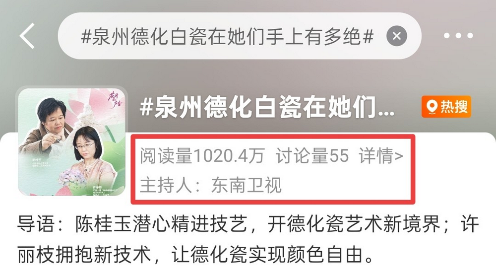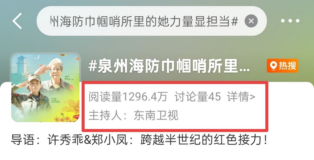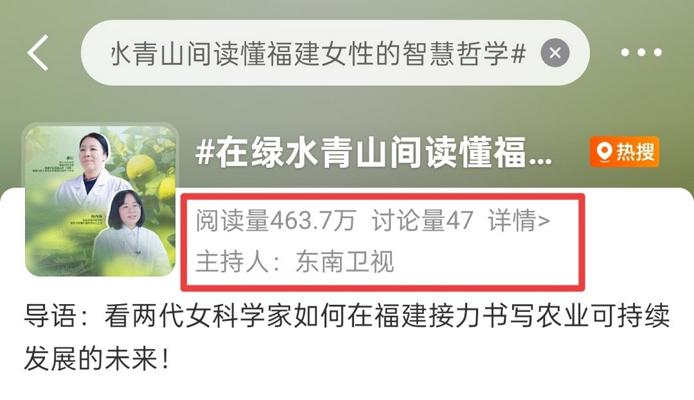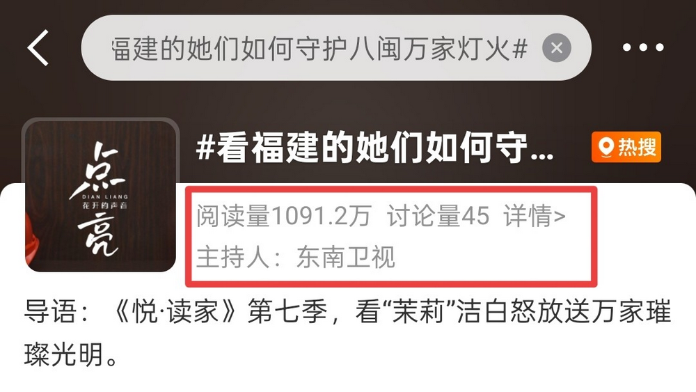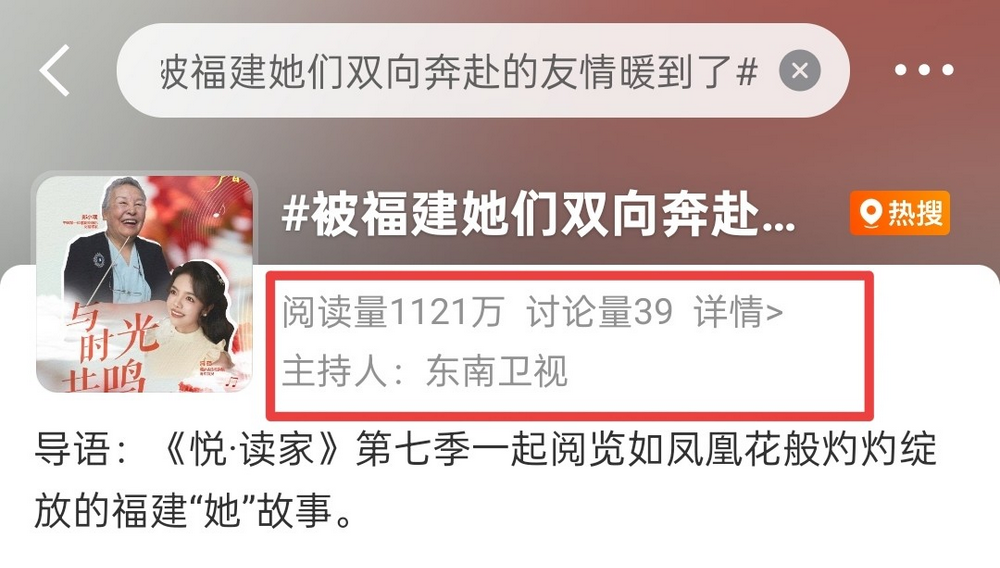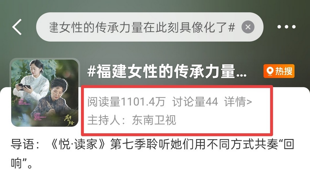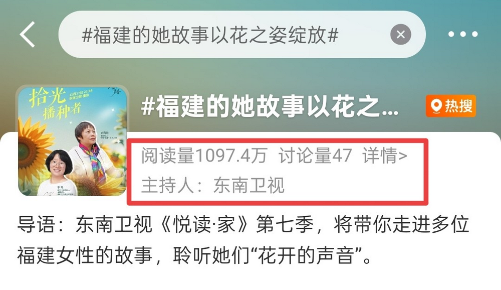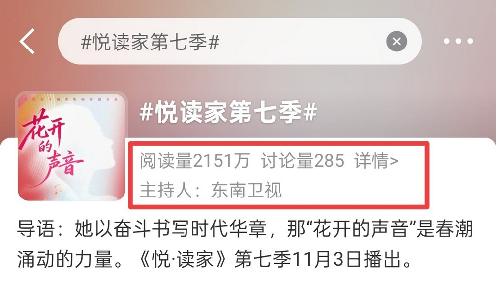 由福建省妇女联合会、福建省妇儿工委办与福建省广播影视集团联合推出的《悦读·家》第七季,以郑小瑛与冯硕的故事开篇,如凤凰花般炽烈,点燃了“传承与赓续”的精神火种。循着这绽放的初声,节目深入八闽科技、文化、经济、公益、两岸融合等多个领域,聆听不同岗位上“她们”悄然盛开的故事。经过两个月与众“花”的美好邂逅,12月22日,这一季的“花开的声音”在温暖的回响中收官。 截至当日22时,本季15期节目在全网传播量1.92亿,微博话题阅读量9347.3万,短视频播放量5858.7万,网络直播观看量4036.7万。节目相关话题阅读量显著,内容引发网友热烈共鸣,主话题#悦读家第七季#阅读量2151万,7个子话题斩获多个微博热搜榜: