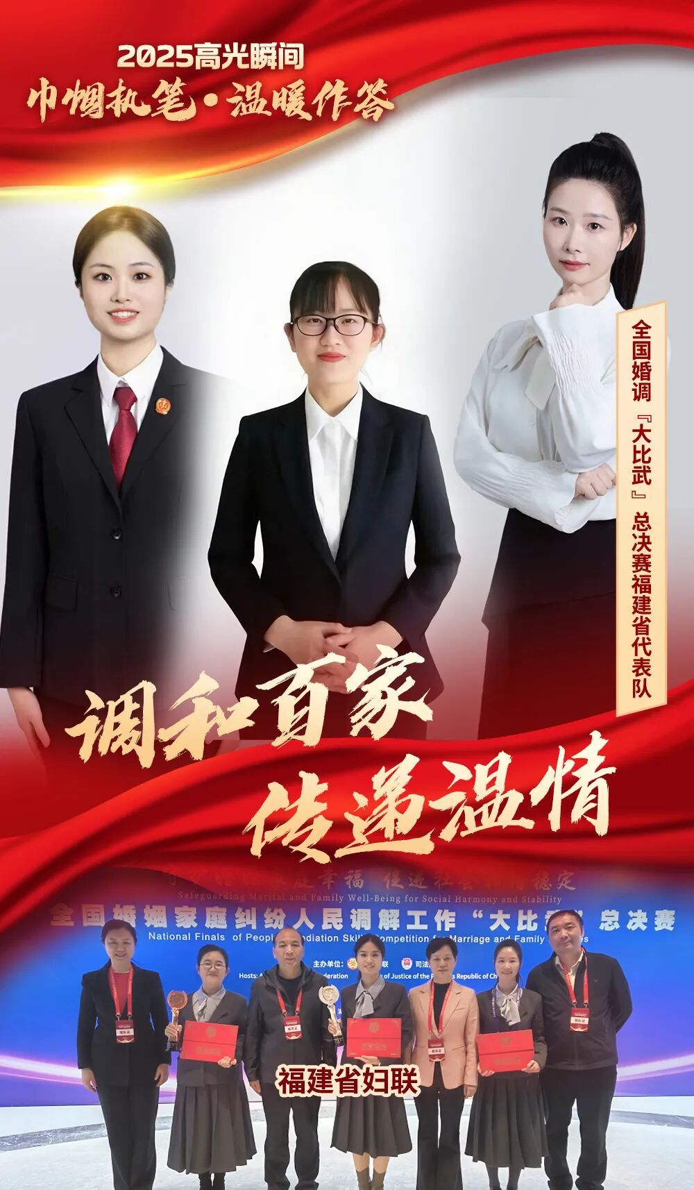 在2025年全国婚姻家庭纠纷人民调解工作“大比武”总决赛的舞台上,她们展现的不仅是专业素养,更是女性的智慧与柔情。她们化纠纷为和谐,守护着万千家庭的安宁与幸福,生动诠释了福建婚调员“专业有温度、调解有力量”的风采。