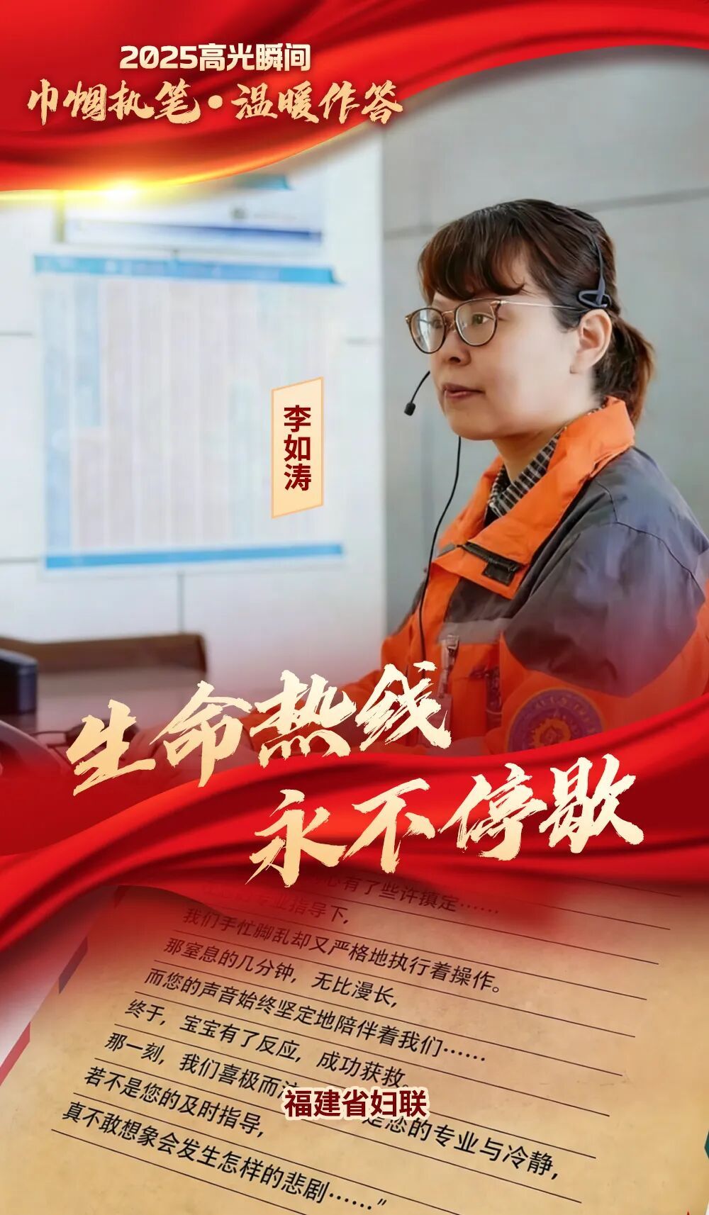 她坚守急救岗位28年,用4分钟“云急救”创造了一场生命奇迹。2025年3月,一名出生仅16天的婴儿呛奶窒息,她接到求助后沉着指挥,通过电话精准施救,挽救生命于危难。这场教科书级别的救援获全网点赞,尽显平凡岗位上的责任与担当。 2025年的高光时刻,属于每一位奋力奔跑的“她”。当岁月翻开新的一页,我们共同期待八闽大地的每一位女性继续怀揣热爱,无畏前行,书写更加璀璨的巾帼华章! |