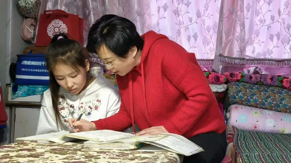 初至木垒县第三小学,她担任英语教师。课堂上孩子们眼中闪烁的好奇与渴望,如同星辰落入她的心田,成为她日夜的牵挂。援疆后不久正值国庆,当许多人计划出游时,她却踏上了一场特殊的“旅程”——主动走访27个学生家庭。她希望深入孩子们的日常,了解他们的生活、家庭与内心世界。其间,四年级(3)班哈萨克族女孩小古丽的情况,深深触动了她。 小古丽年仅十岁,由年老多病的奶奶照料,奶奶还需兼顾农村老家患病的小叔,常感力不从心;姑姑工作繁忙,早出晚归,难以周全照料。孩子常独自在家,显得孤苦无依。目睹此景,同为母亲的她不禁想起远在万里之外的儿子,更生怜惜。她当即决定,要像对待自己的孩子一样,从生活、学习到精神,全方位帮助这个女孩。从此,她与小古丽结为亲人,成为孩子口中的“岳妈妈”。