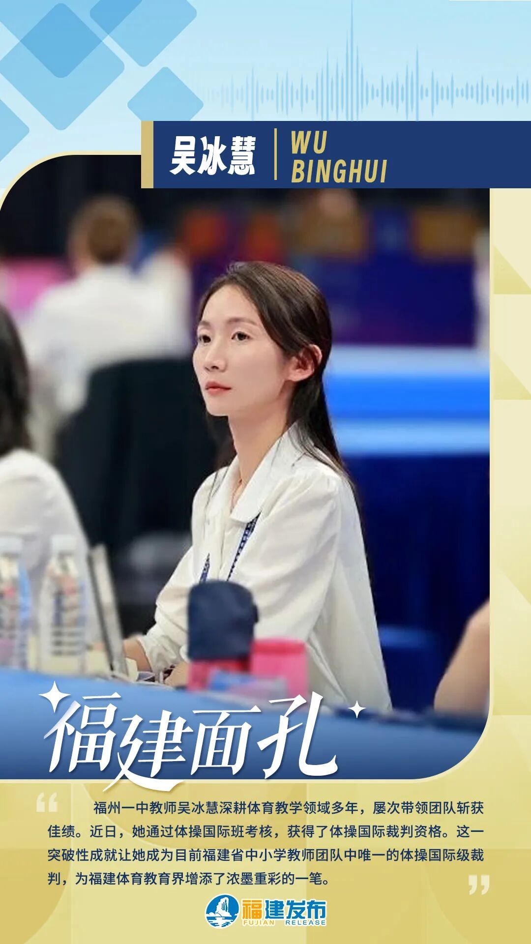 2025年12月 吴冰慧顺利通过体操国际班考核 成功拿下体操国际裁判资格 这一突破性成就 让她成为 目前福建省中小学教师团队中 唯一的体操国际级裁判 为福建体育教育界 增添了浓墨重彩的一笔