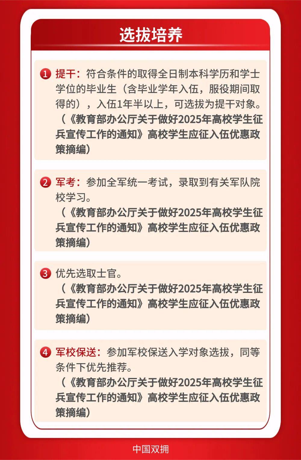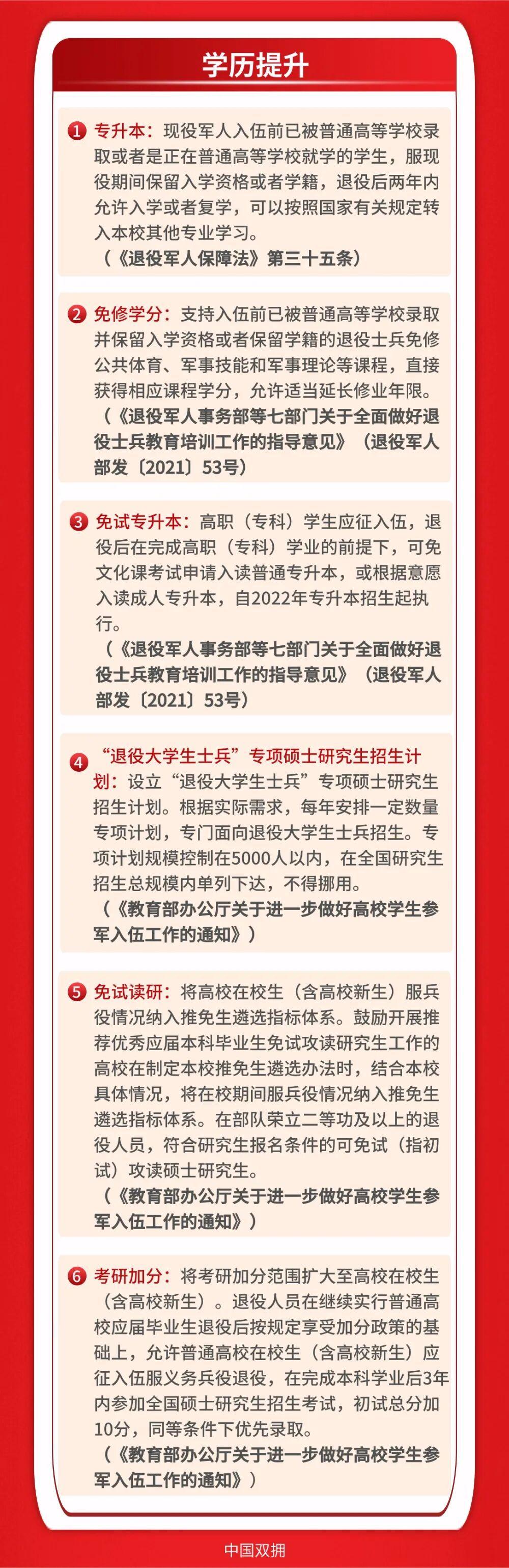 军营如何成就更好的你? 优待、学历、资助、就业和选拔培养 等全国性政策 一图讲清! ↓ ↓ ↓