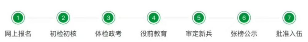 ① 网上报名 符合当年征集基本条件的女青年,在报名通道开启后,可登录“全国征兵网”,填写报名信息。报名截止后,网上报名系统将自动依据报名人员当年高考相对分数进行排序,择优选择初选预征对象。符合国家学费资助条件的,应下载打印《高校学生应征入伍学费补偿国家助学贷款代偿申请表》并交学校学生资助管理部门审核。 ② 初检初核 被确定为初选预征对象的女青年根据地市级征兵办公室通知要求,携带本人身份证(户口簿)、毕业证书(高校在校生持学生证)等相关证件,到指定地点参加初检初核,合格者确定为送检对象。 ③ 体检政考 被确定为送检对象的女青年,根据兵役机关通知,携带本人身份证(户口簿)、毕业证书(高校在校生持学生证)等相关证件,到指定的体检站参加体格检查,由当地公安、教育等部门展开政治考核工作。 ④ 役前教育 兵役机关遴选体检政考“双合格”人员,进行为期1-2周的役前教育,主要开展思想政治学习、政策法规宣讲、光荣传统教育、军事适应训练等内容。 ⑤ 审定新兵 按照国防部征兵办公室下发的《审定新兵实施办法》执行。 ⑥ 张榜公示 省级或地市级征兵办公室及时向社会公示拟批准服现役的应征公民名单,公示期不少于5个工作日。 ⑦ 批准入伍 公示后,由县级征兵办公室正式批准入伍,发放《入伍通知书》和部队被装。应征青年凭《入伍通知书》享受义务兵优待,等待交接起运,统一输送至部队服役。申请学费资助的,还要将加盖有县级征兵办公室公章的《高校学生应征入伍学费补偿国家助学贷款代偿申请表》原件和《入伍通知书》复印件,寄送至原就读高校学生资助管理部门。 注意 进行网上报名时,务必认真填写个人信息,包括姓名、身高、体重、视力、应征地等关键内容,填写完成后务必反复核对无误再提交! 特别注意:提交信息并完成系统初选后,上述信息将无法修改,即使审核未通过也不能更改,一定要格外细心,避免因信息错误影响报名哦!