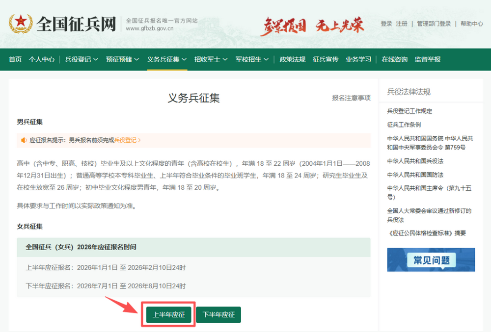 正值青春的你 有没有想过给自己的人生 留下一段特别的军旅记忆? 2026年上半年女兵应征报名已经启动! 一份超全入伍指南 解答你从报名到入伍的所有疑问 助你顺利开启迷彩青春! 核心条件自查,你符合吗? 全国征兵(女兵)2026年应征报名时间 上半年: 2026年1月1日至2026年2月10日24时 下半年: 2026年7月1日至2026年8月10日24时 女兵报名对象 ★ 上半年: 普通高等学校和科研机构全日制应届毕业生及在校生,年满18至22周岁(2004年1月1日—2008年12月31日出生); 全日制研究生应届毕业生及在校生放宽至26周岁; 普通高等学校全日制本专科往届毕业生可以报名参加2026年上半年女兵征集,年龄放宽至23周岁。 ★ 下半年: 普通高中应届毕业生、普通高等学校和科研机构全日制应届毕业生及在校生,年满18至22周岁(2004年1月1日—2008年12月31日出生); 全日制研究生应届毕业生及在校生放宽至26周岁。 女兵报名方式 适龄女青年可登录 全国征兵报名唯一官方网站 全国征兵网 https://www.gfbzb.gov.cn