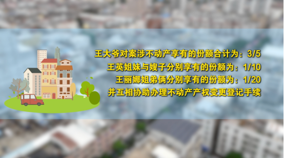 因此,城厢区人民法院最终判决:王大爷对案涉不动产享有的份额合计为:3/5;王英(化名)姐妹与嫂子分别享有的份额为:1/10;王丽娜(化名)姐弟俩分别享有的份额为:1/20;并互相协助办理该不动产的产权变更登记手续。