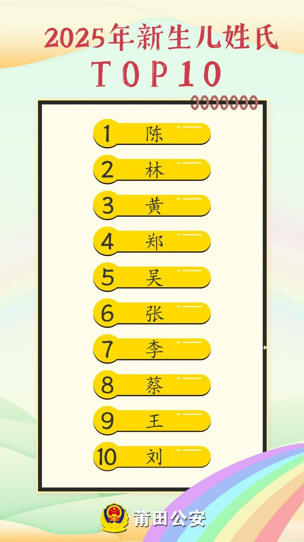 在2025年莆田市出生登记的 新生儿中 姓氏排行榜前十的分别依次是: “陈”“林”“黄”“郑”“吴” “张”“李”“蔡”“王”“刘” 其中前三名的人数依次是: 1.“陈”姓,2689人 2.“林”姓,2486人 3.“黄”姓,1275人