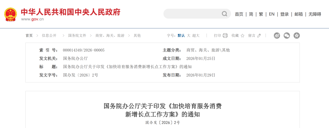 国务院办公厅关于印发《加快培育服务消费 新增长点工作方案》的通知 国办发〔2026〕2号 各省、自治区、直辖市人民政府,国务院各部委、各直属机构: 《加快培育服务消费新增长点工作方案》已经国务院同意,现印发给你们,请认真贯彻执行。 国务院办公厅 2026年1月25日 (本文有删减) 加快培育服务消费新增长点工作方案 为优化和扩大服务供给,聚焦重点领域、潜力领域,加快培育服务消费新增长点,促进服务消费提质惠民,为经济高质量发展提供有力支撑,制定本工作方案。 一、激发重点领域发展活力 (一)交通服务。制定出台促进铁路与旅游融合发展的专项支持政策,加快车站、列车旅游化改造,开发特色化旅游专线,打造多样化旅游专列产品,推出一批银发旅游等主题列车,提升铁路旅游服务和运行保障水平。支持有条件的地方开展邮轮消费创新,提升邮轮服务水平,打造融合消费场景,开发沉浸式、多元化邮轮消费产品。促进夜游船持续健康发展,推动夜游船提质升级与创新发展。促进游艇消费高质量发展,修订游艇安全管理规定等相关规章制度,保障游艇业健康发展,加强公共码头和泊位等游艇基础设施和配套服务保障。依托中国国际消费品博览会等打造游艇展示交易平台,支持有条件的地方创新推出一批游艇消费场景。优化休闲渔业船舶管理。 (二)家政服务。支持符合条件的家政服务企业创新服务模式、探索智慧化场景、拓展居家养老服务。鼓励地方发布家政服务规范协议。对家政领域人力资源服务机构开展分级分类监管。开展家政服务职业技能专项培训行动,提升家政服务职业化水平。推动中介制家政企业向员工制转型,培育一批家政行业龙头企业。 (三)网络视听服务。研究支持民营资本依法依规开展网络视听服务。健全支持政策体系,促进超高清视频、微短剧等网络视听服务市场有序竞争、创新发展,强化网络视听生态治理,丰富优质内容供给。支持超高清关键核心技术攻关和产业化应用、制播能力提升、网络升级改造及终端更新升级,推进超高清端到端全链条贯通。 (四)旅居服务。培育一批旅居目的地城市(区域)。鼓励有条件的地方发挥相关财政资金、产业基金引导作用,完善旅居目的地基础设施,推动存量设施提升改造。依法盘活用好农村闲置土地和房屋。鼓励地方结合消化存量房地产等政策落实,支持旅居项目用地和服务设施建设。引导有条件的地方发展特色旅居细分市场,培育高品质旅居目的地和公共区域品牌。加强旅居区域协调合作和跨区域公共服务互通共享,支持旅居目的地结合市场需求适度扩大公共服务供给。 (五)汽车后市场服务。推动汽车流通消费领域全链条创新发展,选择部分城市开展试点,支持在汽车后市场重点领域先行先试,加快清理限制性措施,探索开展汽车改装分级分类管理,健全传统经典车认定体系,加强房车露营基地建设,研究完善相关管理制度、技术标准。加强国际合作,发展汽车文化,支持汽车博物馆建设运营,鼓励举办相关赛事及活动,打造汽车与旅游、文化、体育等跨界融合创新项目。推动小微型客车租赁高质量发展,完善小微型客车租赁服务网络,培育壮大经营主体,提高租赁服务水平。进一步促进自驾游发展,改善自驾游交通运输条件,为自驾游营造安全、舒适、便捷的出行环境。 (六)入境消费。做好单方面免签国家试行期限延长相关工作,研究稳妥扩大单方面免签、过境免签、区域性免签政策适用范围。加强入境政策和入境旅游海外宣传,加快入境签证全流程在线办理全球覆盖,提升境外人员出入境和入境居住便利度。加强入境消费场景建设,创新中国消费名品场景化体验,培育高质量国际赛事、演出、医疗、教育、旅居、康养品牌。打造“购在中国”品牌,推进国际化消费环境建设,培育国际消费集聚区、入境消费友好型商圈,优化涉外支付服务,增加离境退税商店,提升公共场所多语种标识覆盖率和国际化服务水平。 二、培育潜力领域发展动能 (七)演出服务。优化演出管理,科学合理设置安全容量限制,持续推进跨地区巡演。探索将具备条件且有意愿的演出团体、专业剧场调整为公益二类事业单位,建立健全激励机制。规范票务市场,完善票务发行、退票制度,加大对票务平台及转售平台的监管力度,加强对代抢、倒卖等行为的打击和惩戒。 (八)体育赛事服务。优化改进大型群众性活动安全管理,分级分类合理核定赛场安全容量,用于划设治安缓冲区的容量原则上不超过赛场可用座位数的10%。增加优质赛事供给,鼓励引进一批国外优秀体育赛事,支持地方举办群众性体育赛事,打造一批知名精品赛事、职业联赛、体育竞赛表演、青少年体育赛事、老年体育赛事、乡村文体赛事品牌,推动高质量户外运动目的地建设。加快重点赛事市场化、商业化运作,推动赛事消费发展。结合消费新业态新模式新场景培育、高质量户外运动目的地建设等,支持冰雪服务相关消费载体建设,支持符合条件的地方创新打造多元化冰雪消费场景。 (九)情绪式、体验式服务。创新监管方式,对新业态实施包容审慎监管,逐步完善相关监管要求。支持将具备条件的情绪式、体验式服务相关职业纳入国家职业分类体系。依托消费新业态新模式新场景试点等平台载体,支持建设若干消费带动作用强的情绪式、体验式服务消费