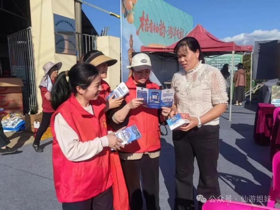 莆田市仙游县巾帼志愿者向过往行人发放防骗宣传手册,普及识别与防范诈骗的知识。