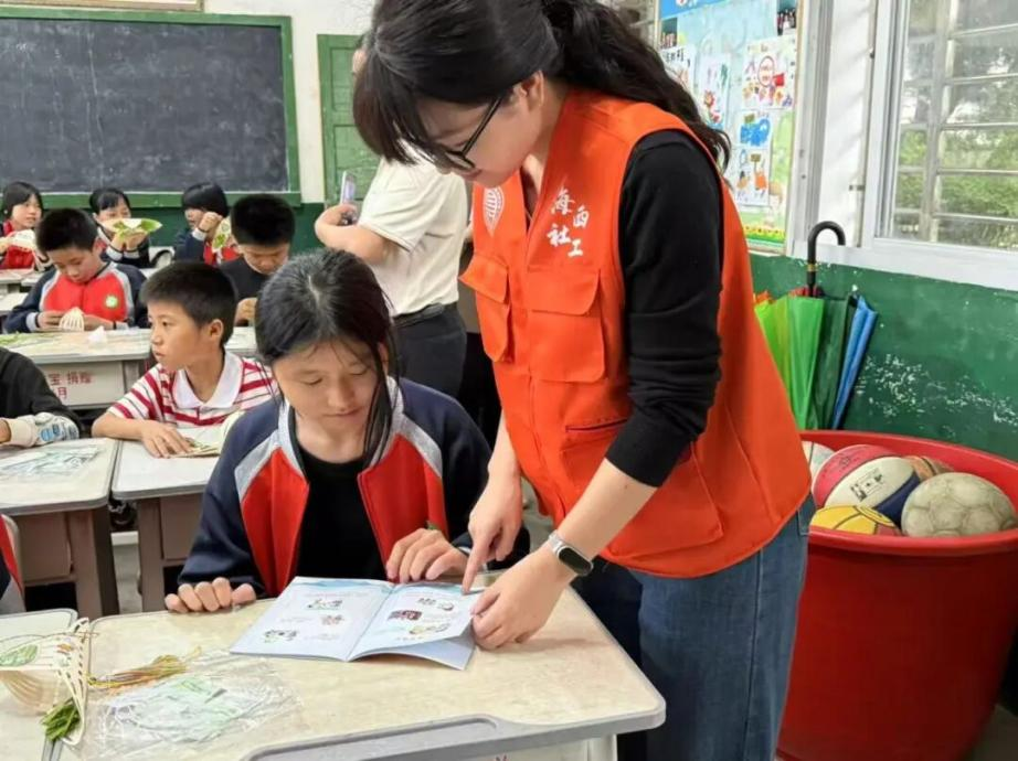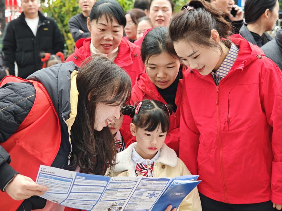泉州市安溪县巾帼志愿者化身反诈宣传员走进校园,为小朋友解读防诈宣传册。