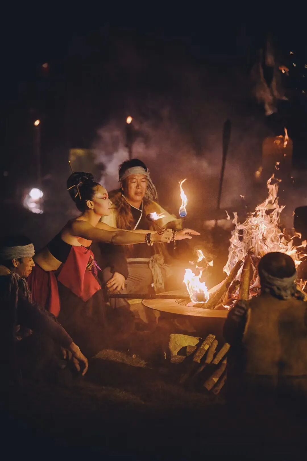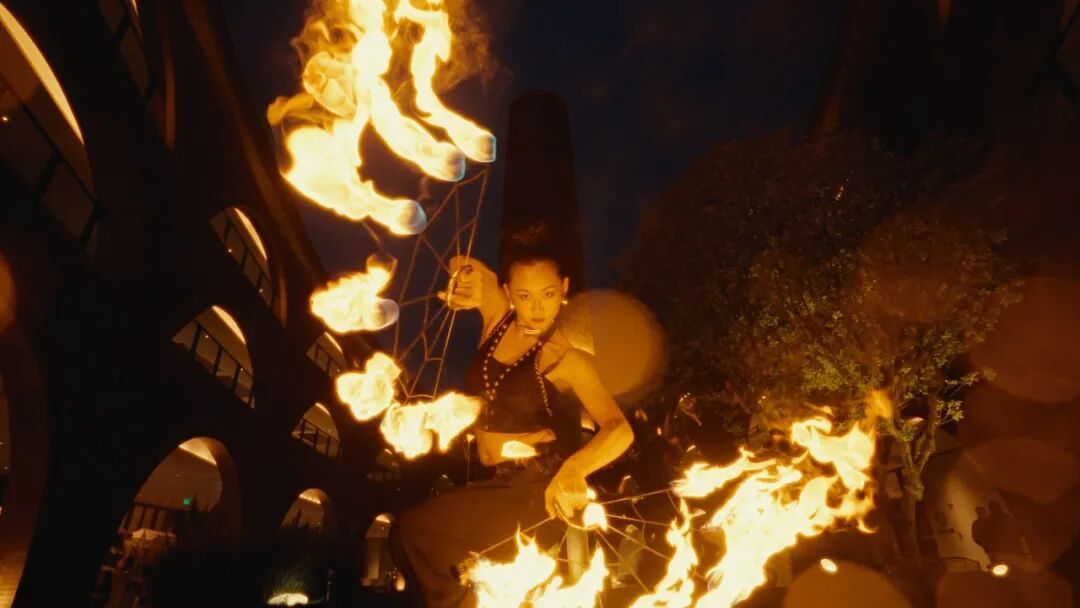 01 玩最野的火 2025年十一假期,夜色如水,月华如练。北京通州九棵树未来艺术中心的露天剧场内,3000多双眼睛齐齐凝视着水面舞台。忽然,鼓点如远古心跳般破空而来,一道身影自暗处缓步而出,正是火舞表演者云一。 舞台上,云一手持两把扇形火棍,棍端火舌飞舞。她脸上绘着赤金花纹,眉心一点朱砂宛若点睛;麻布长裙缀满铜铃,每一步的金属脆响与火焰噼啪声交织回响。火焰流转间,火花如星雨洒落水面,让这月明之夜更添几分火热的艺术张力。 行进间,云一双臂扬起,数道火柱腾空旋转,似古老祭坛上苏醒的巨龙,昂首舔舐夜色。她旋身,火星沿裙摆边缘炸裂成流星雨,铜铃脆响与烈焰呼啸交织成独特韵律;她俯身,火舌贴地掠过,带着一种与自然对话的敬畏;她跃起,火焰在背后交叠成燃烧的十字,仿佛要将炽热印记烙进夜空。